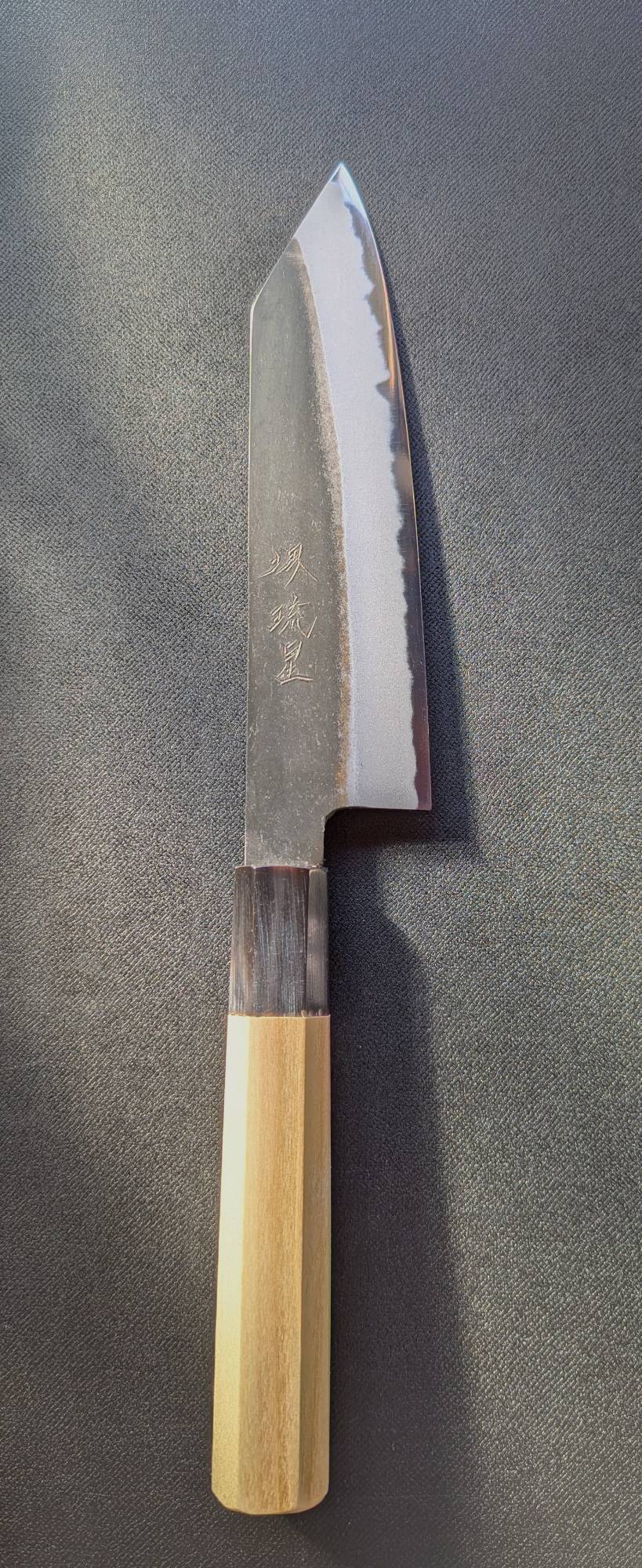 FR: Couteau polyvalent Santoku kiritsuke de 18cm brut de forge en acier carbone shirogami 2 monté sur un manche en bois de magnolia et corne de buffle
