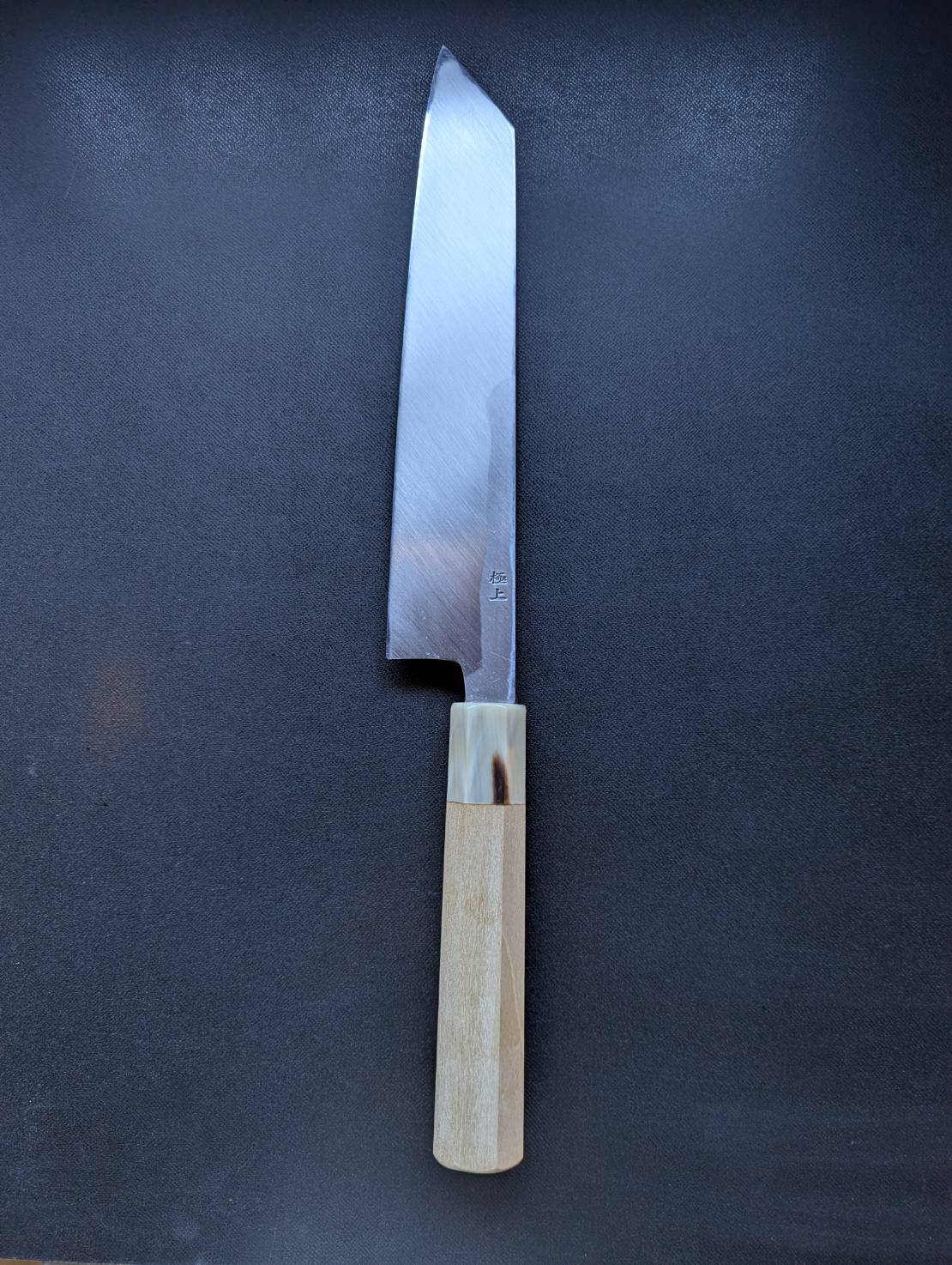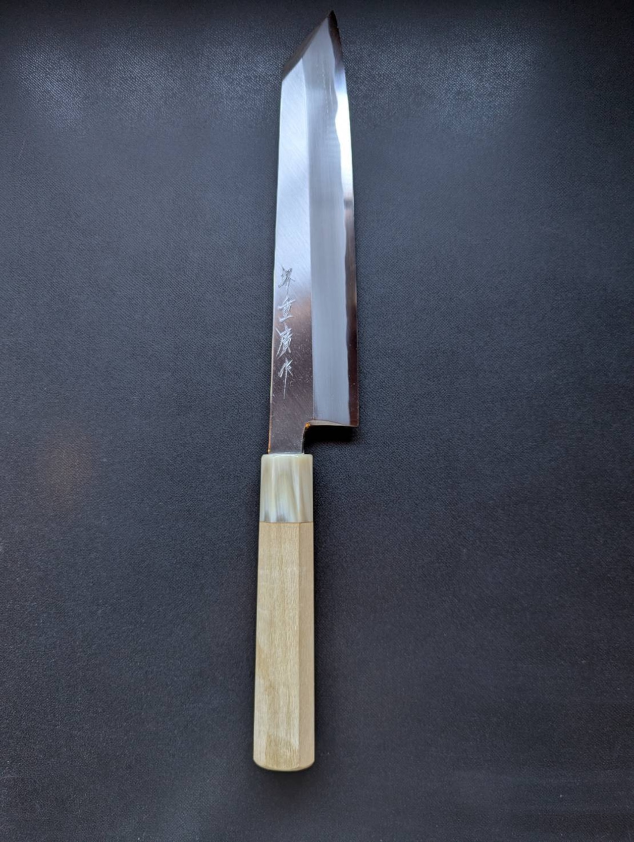 Magnifique couteau de chef traditionnel Kiritsuke simple biseau de 24cm en acier carbone shirogami 2, manche en bois de magnolia et corne de buffle.